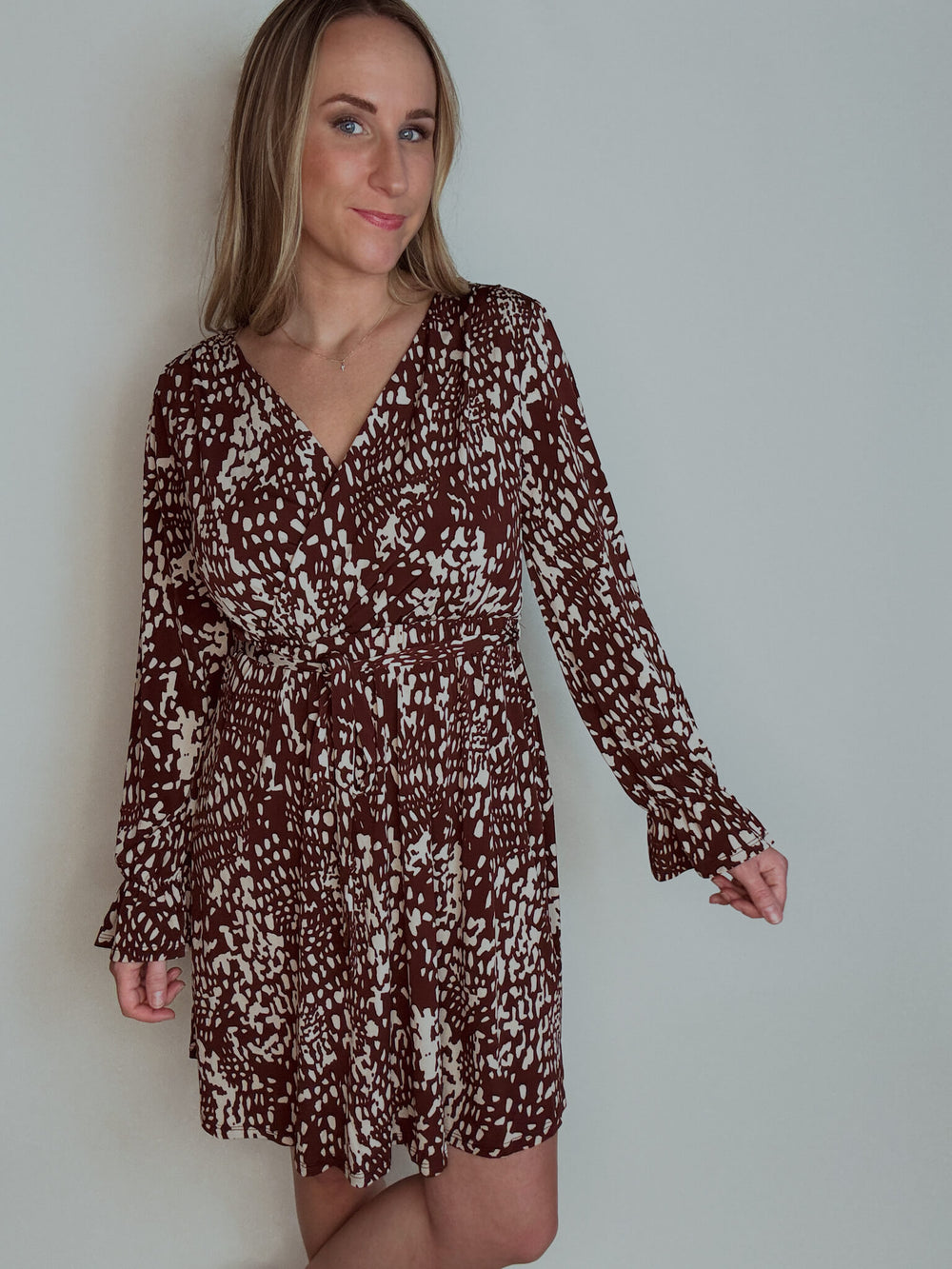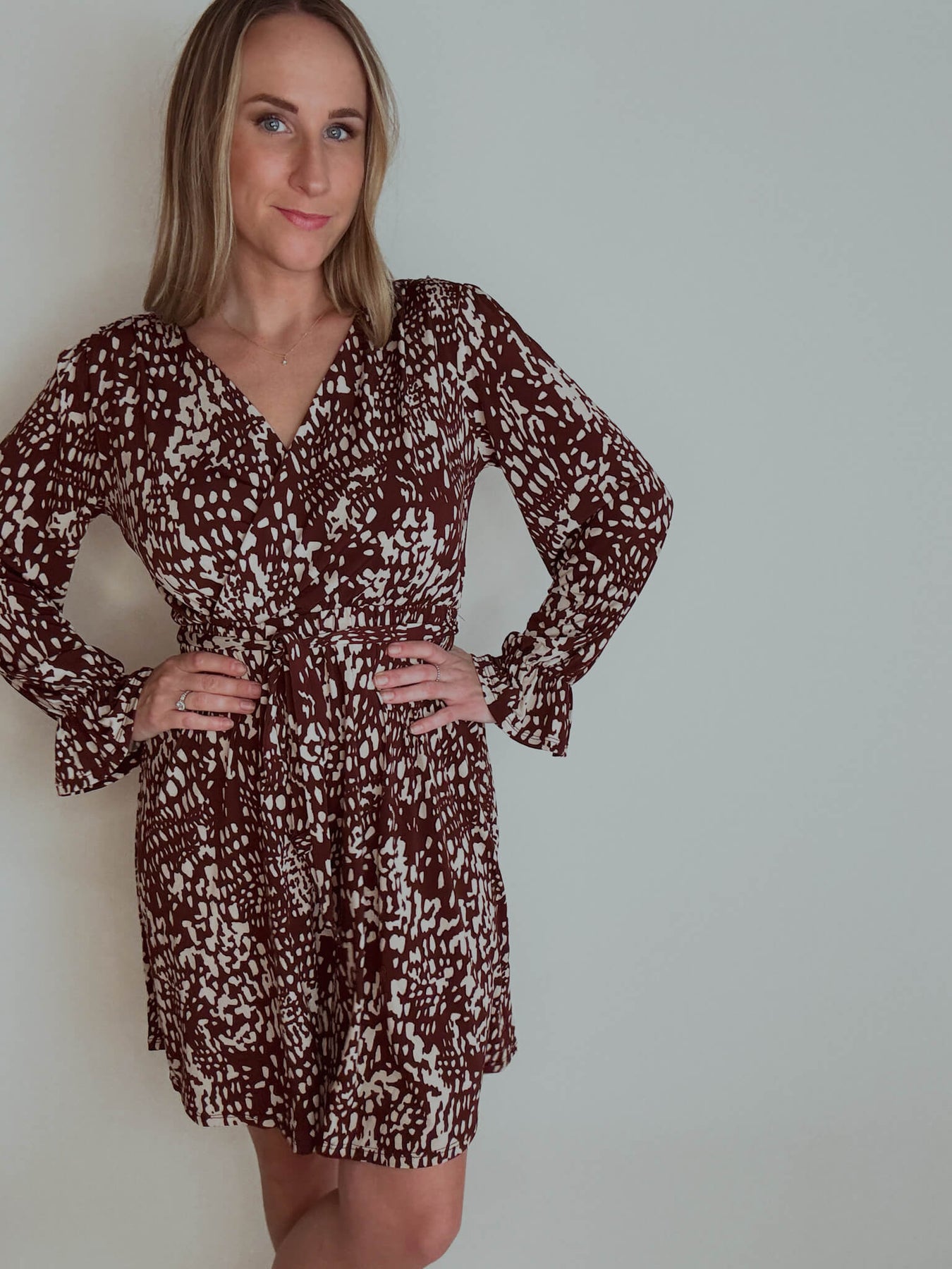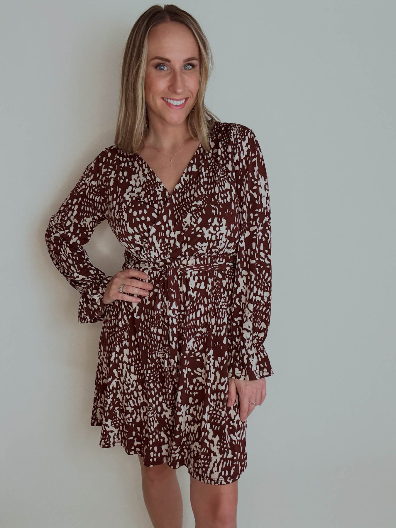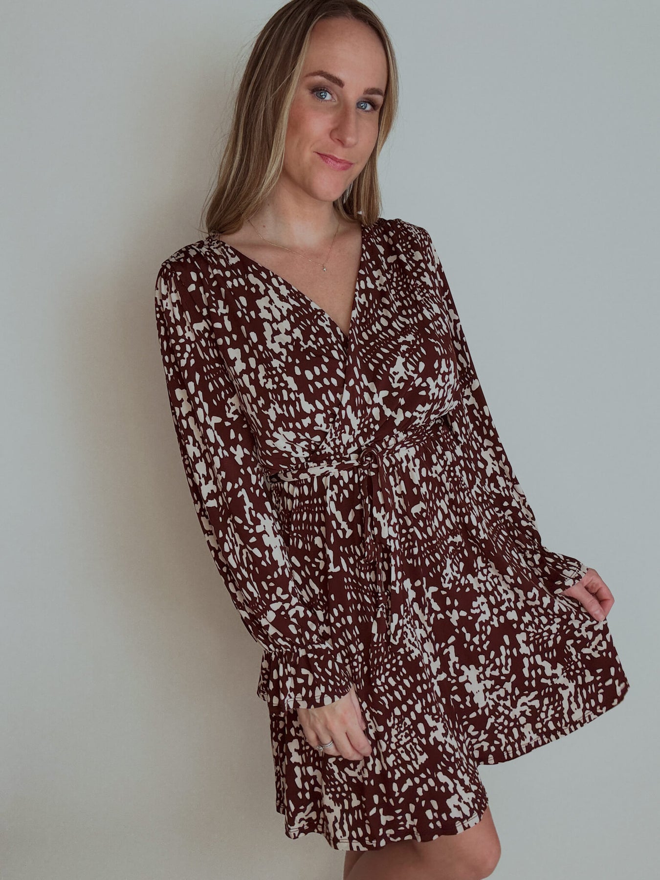 The Isabella Abstract Surplice Mini Dress offers a sophisticated silhouette with its elegant wrap design and soft fabric. Perfectly blending style and comfort, this dress drapes beautifully for an effortlessly refined look that transitions seamlessly from day to night.