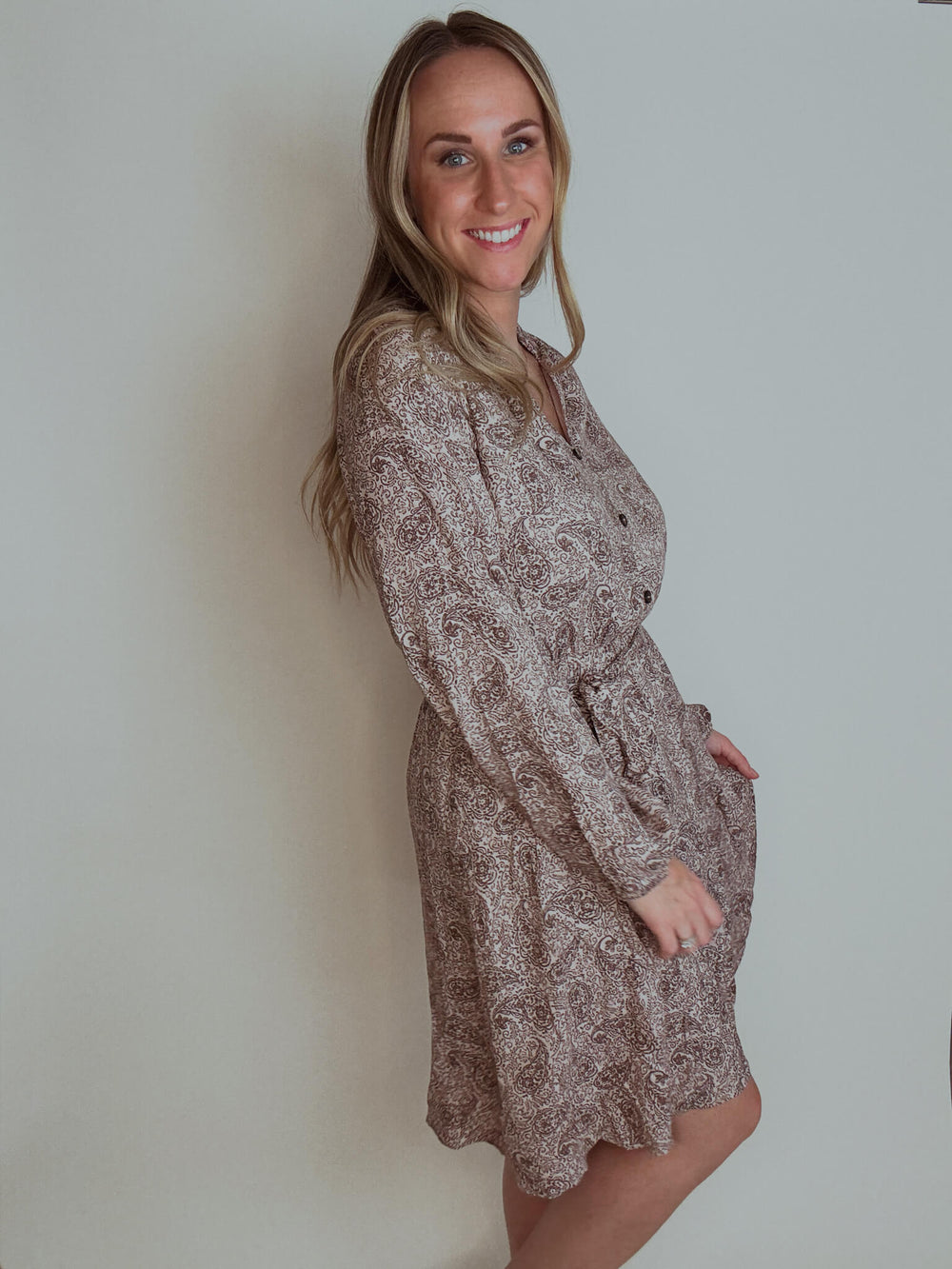 The Winslow Paisley Mini Dress combines softness and elegance with its flowy fabric and flattering v-neck collar. Its adjustable belt allows for a personalized fit, enhancing your silhouette effortlessly. Perfect for occasions where you want to feel both comfortable and stylish, this dress brings a touch of class to your wardrobe. Pair it with your favorite Fall boots for the completed look!