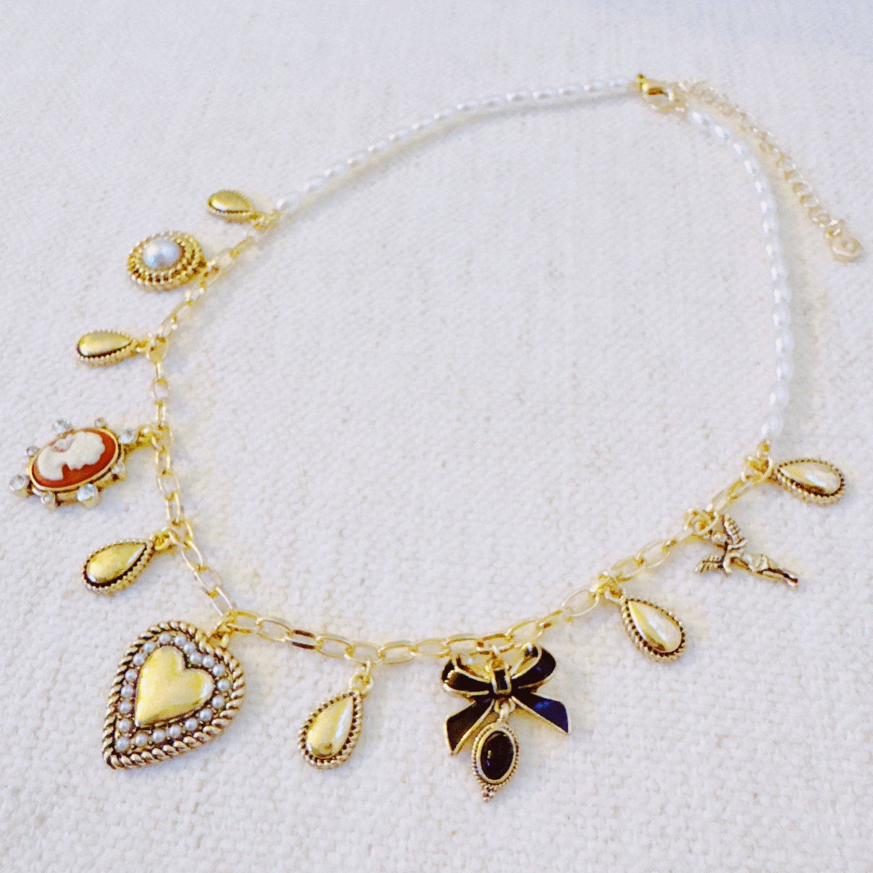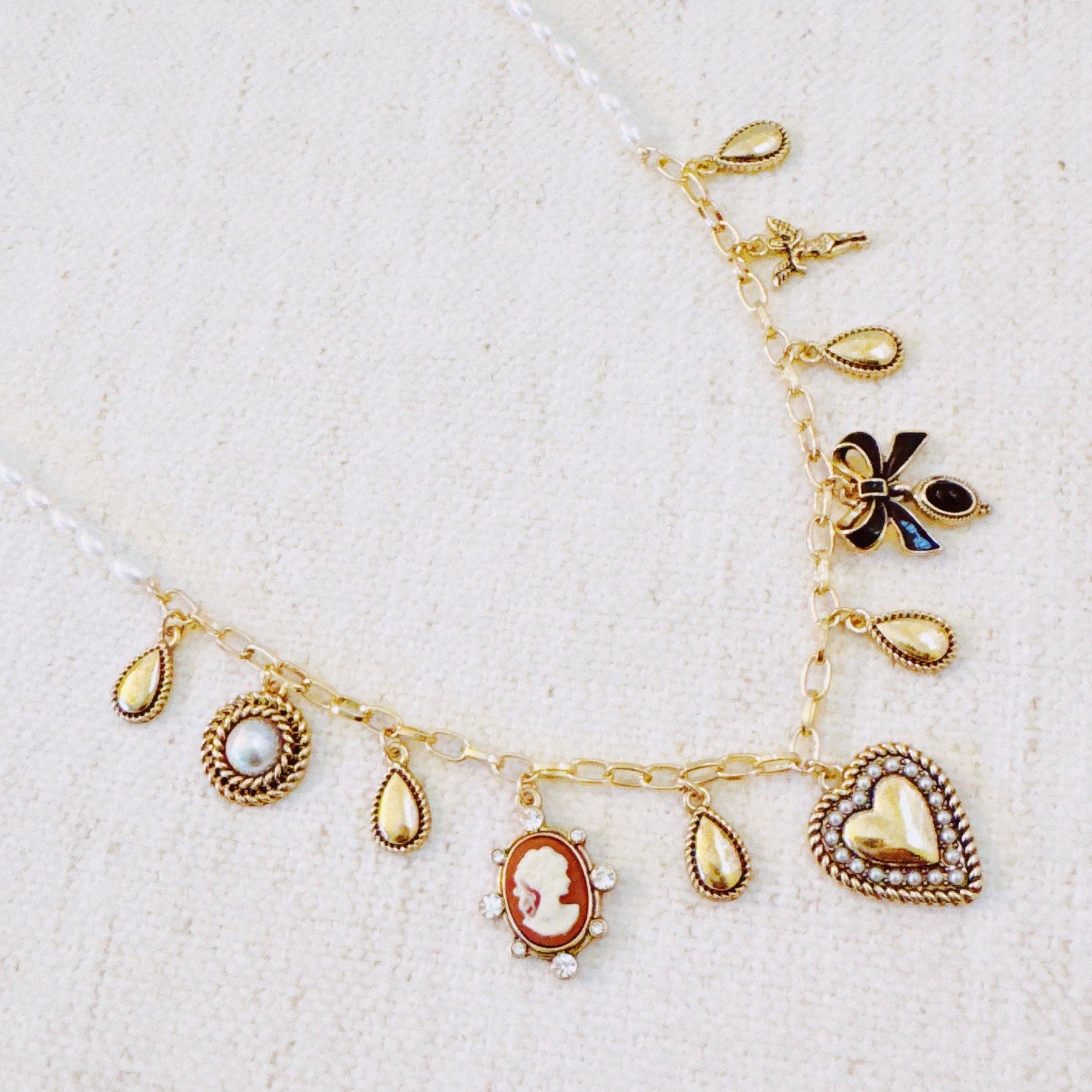 Heart & Cameo Charm Necklace – Romantic Gold Chain with Bow and Vintage-Inspired Details