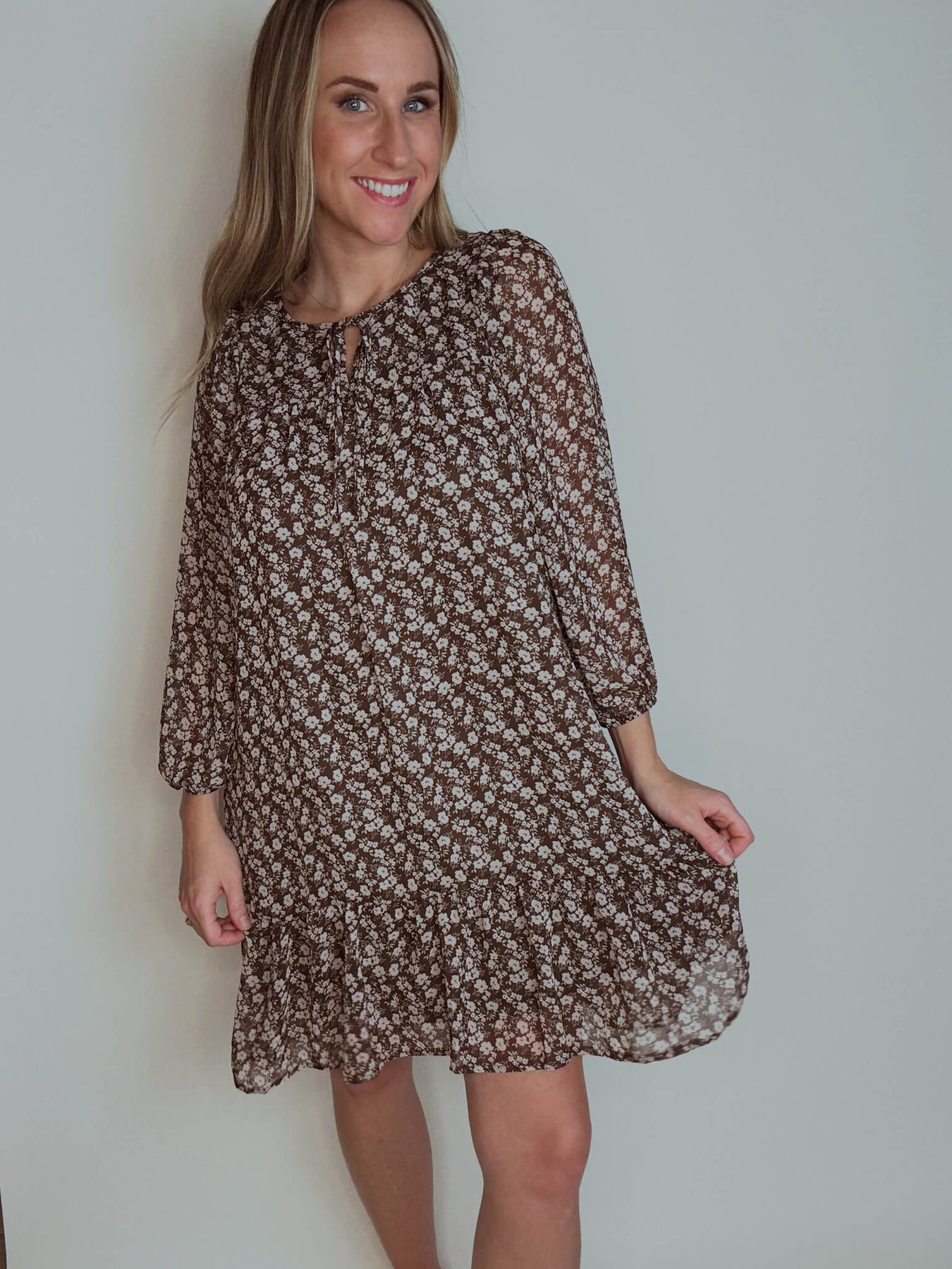 This Brown Ditsy Floral Mini Dress features a charming tiered ruffle hem that adds a playful, feminine touch to your look. Fully lined for comfort and quality, it pairs perfectly with your favorite Fall boots, making it an effortless choice for seasonal style and warmth. Embrace the beauty of autumn with this versatile and flattering dress.