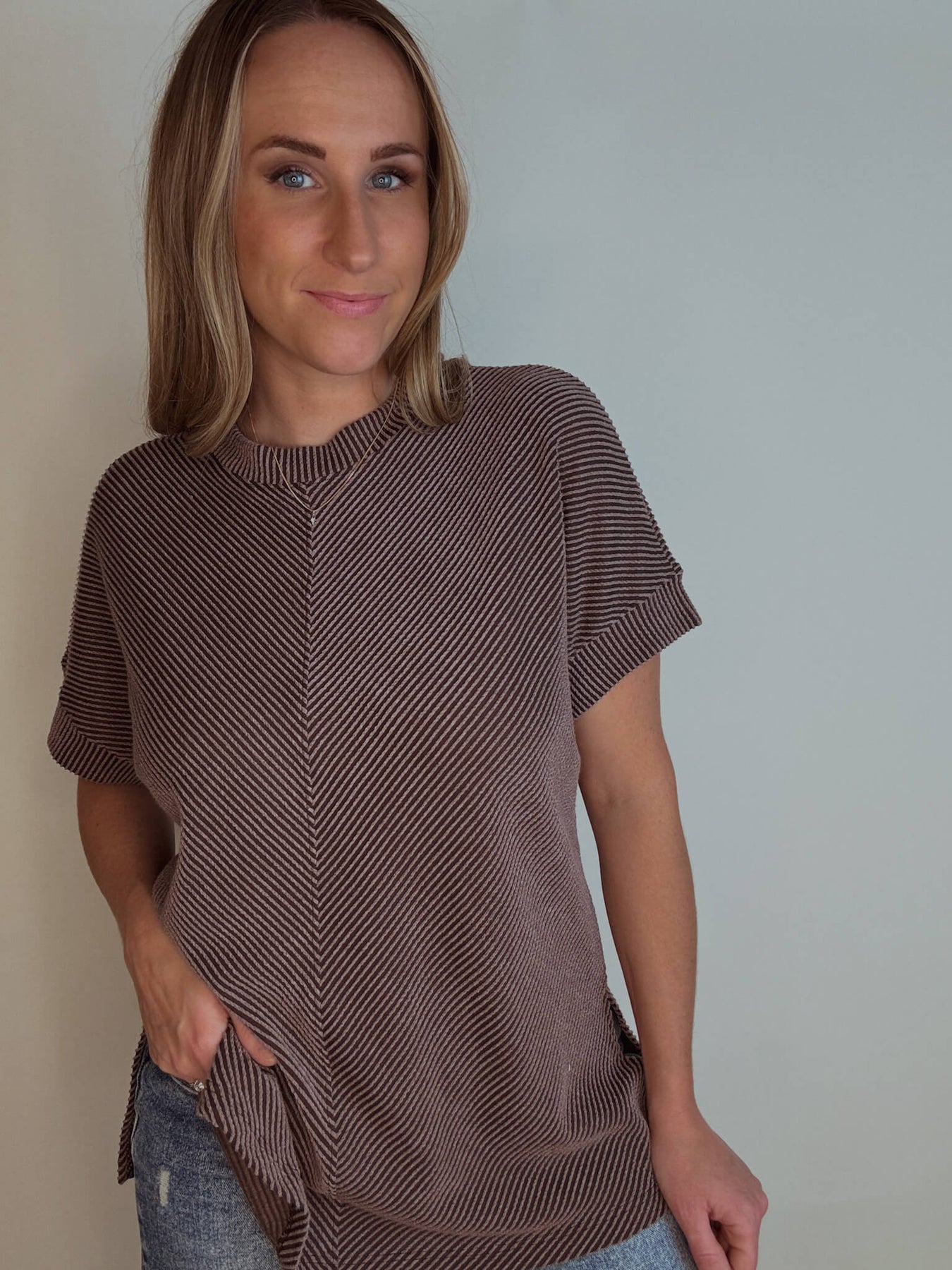 Experience effortless style with this Brown Ribbed Short Sleeve Top, designed for a loose, relaxed fit that moves with you. Its longer length and side slits add a modern edge while enhancing comfort and breathability. Perfect for layering or wearing on its own, this versatile top combines casual ease with polished appeal for your everyday wardrobe.