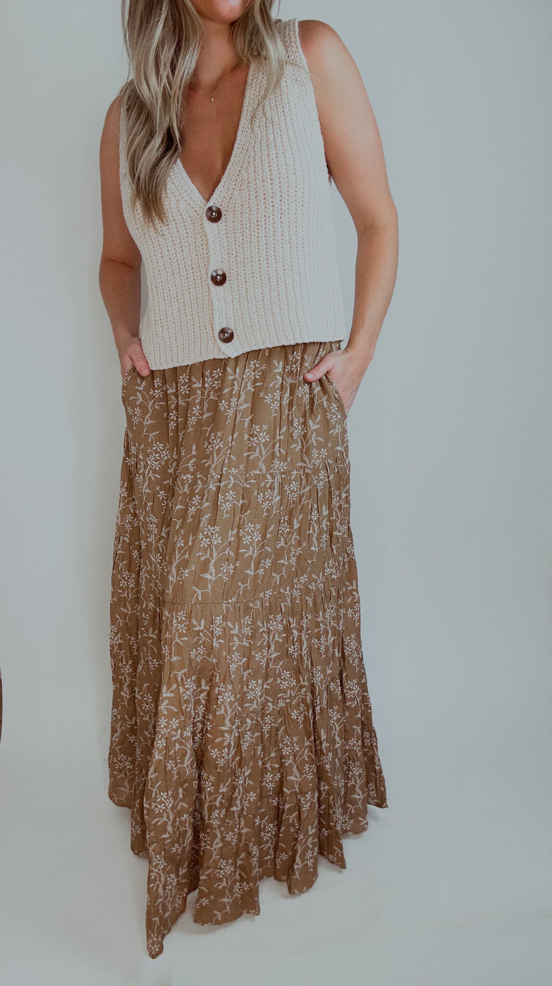 Falling Florals Pocketed Tiered Maxi Skirt - Camel