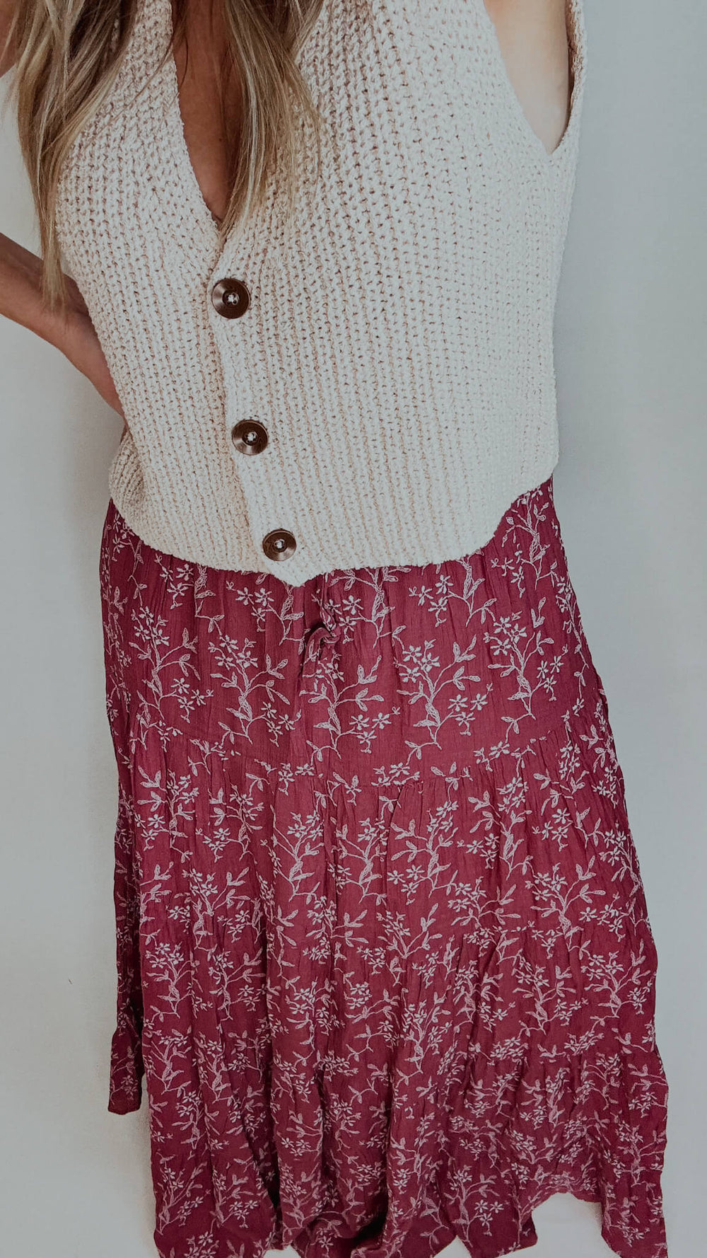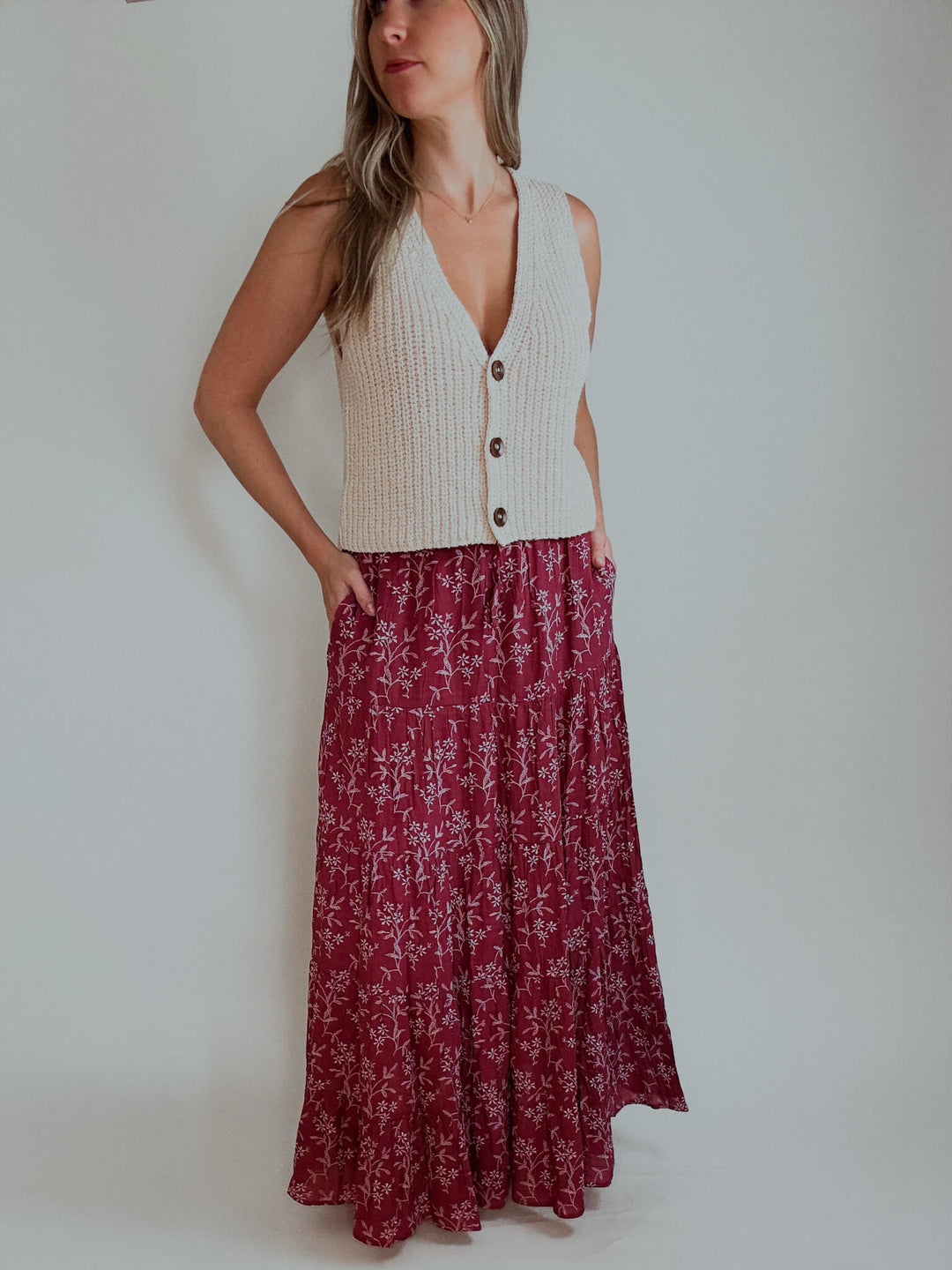 Falling Florals Pocketed Tiered Maxi Skirt - Marsala
