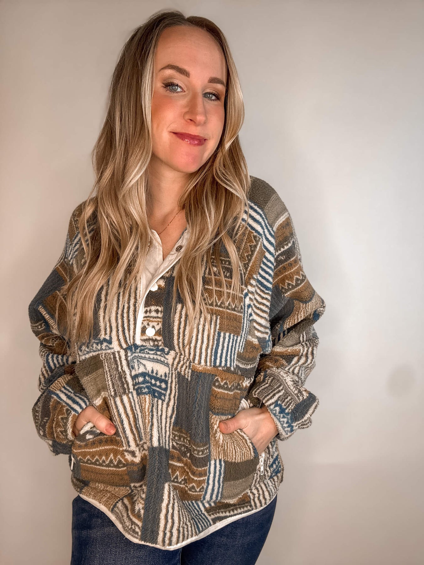 Wrap yourself in comfort with this patchwork print button sweatshirt that feels like wearing your favorite blanket. The relaxed fit and soft fabric make it perfect for lounging or casual outings. Functional side pockets with zippers to keep your essentials secure and within reach.