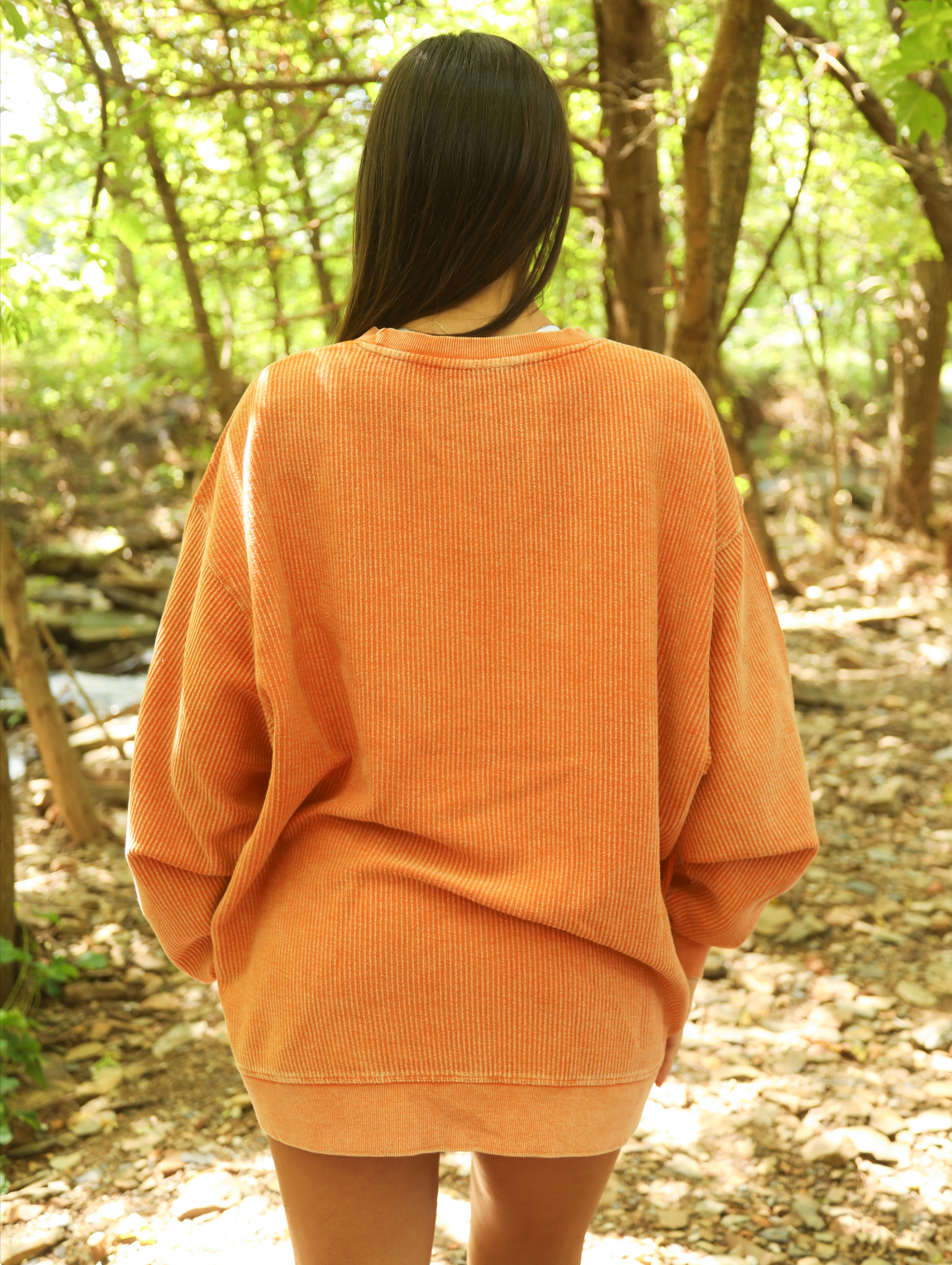 Say BOO! This classic orange corded crewneck features an oversized white BOO perfect for the Spooky Season.